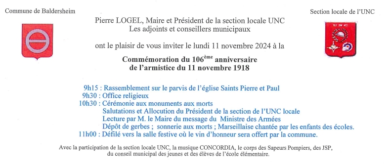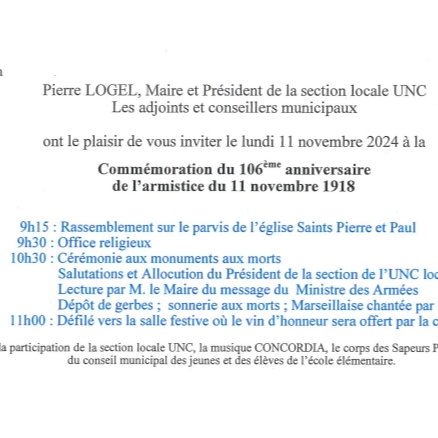 La commune et l'UNC locale invite à commémorer le 106 ème anniversaire du 11 novembre